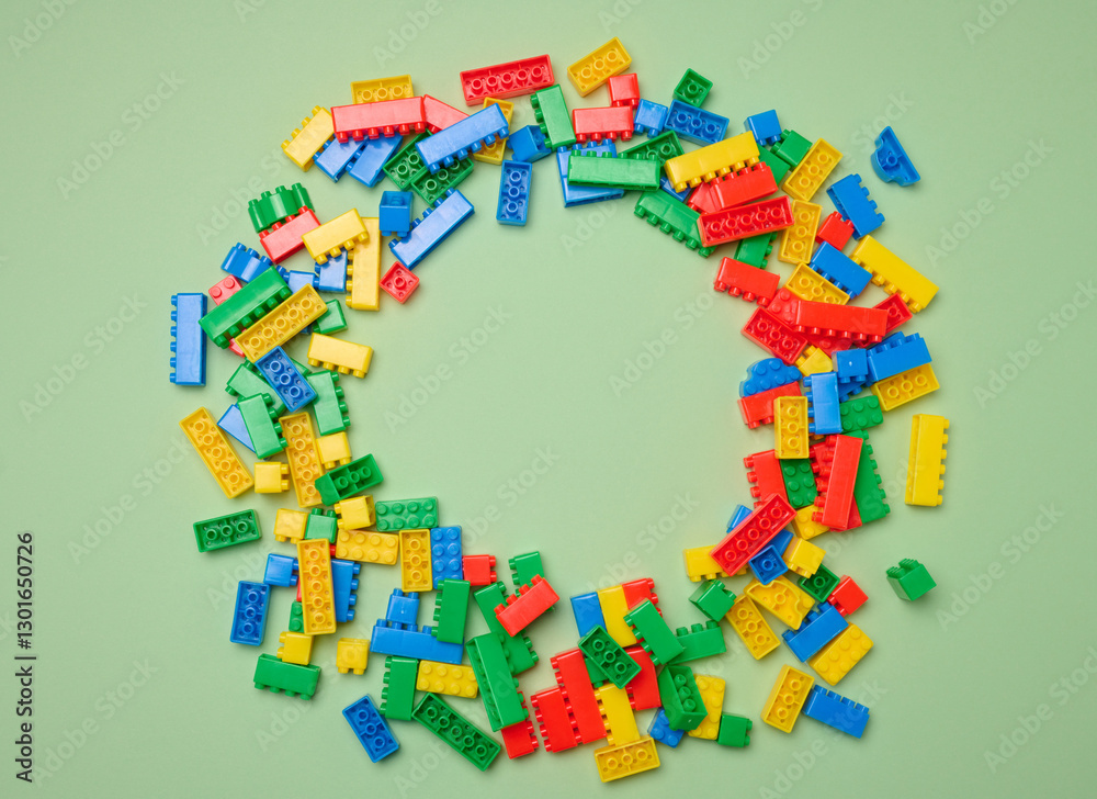 Scattered plastic multi-colored parts of children's construction set on green background, top view