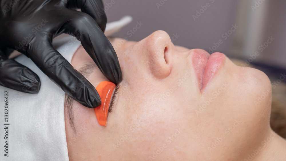 The master lays down the roller before the eyelash lamination procedure.