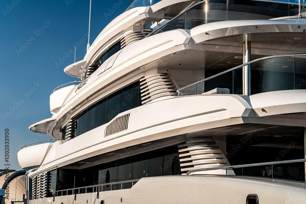 Architectural and nautical design detail of a large superyacht at dock in Genova, Italy