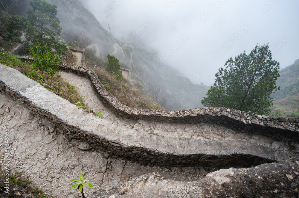 Looking down at the path climbing the cliff of Paul valley, on Santo Antao island, Cape Verde