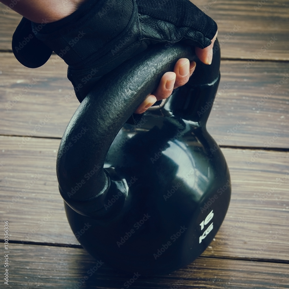 Close up of black kettlebell and sport gloves on dark background. Concept for gym and fitness.