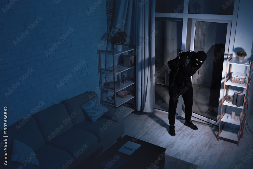 Housebreaking Concept. Intruder sneaking into house at night, holding crowbar, top view from above camera, high angle