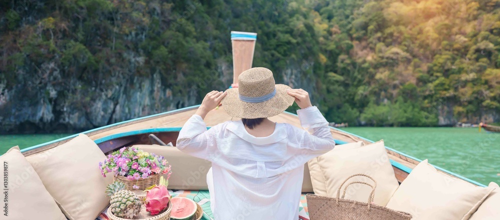 Happy Woman tourist in private longtail boat trip to koh Hong lagoon island at Krabi, Thailand. landmark, tropical destination, southeast Asia Travel, summer vacation, wanderlust and holiday concept