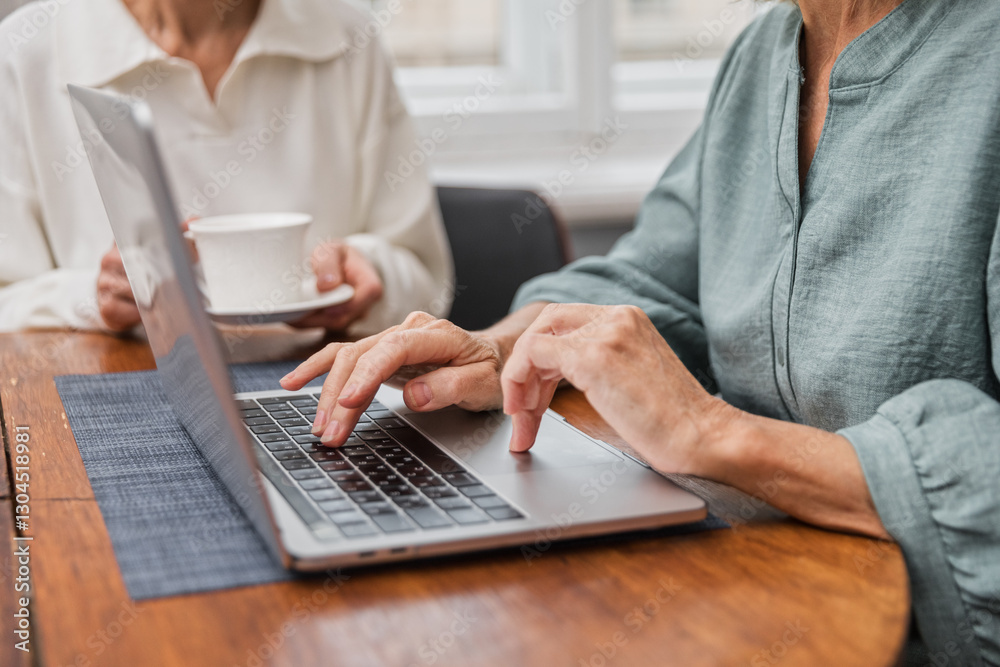 Three elderly women gather at home to spend time together and chill. Elegance blonde senior women use laptop computer and discuss. Female aged friends typing on keyboard and pointing at screen