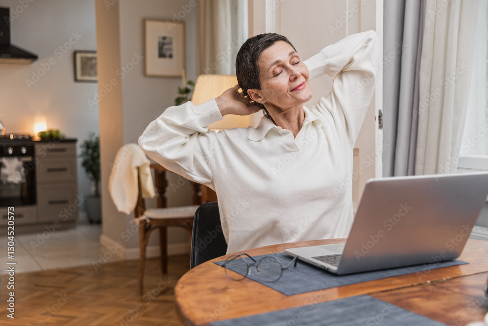 Senior elegant woman sits at table typing on keyboard. Cheerful aged woman working remotely using laptop. Older focused businesswoman browsing online. Female elegant writer enjoying creative process