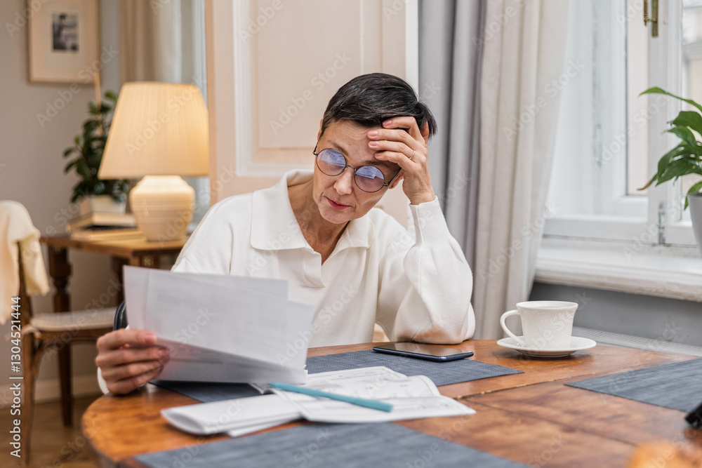 Senior elegant woman sits at table viewing papers and utility bills. Aged woman works remotely at home. Older focused businesswoman making notes. Female elegant writer on creative process