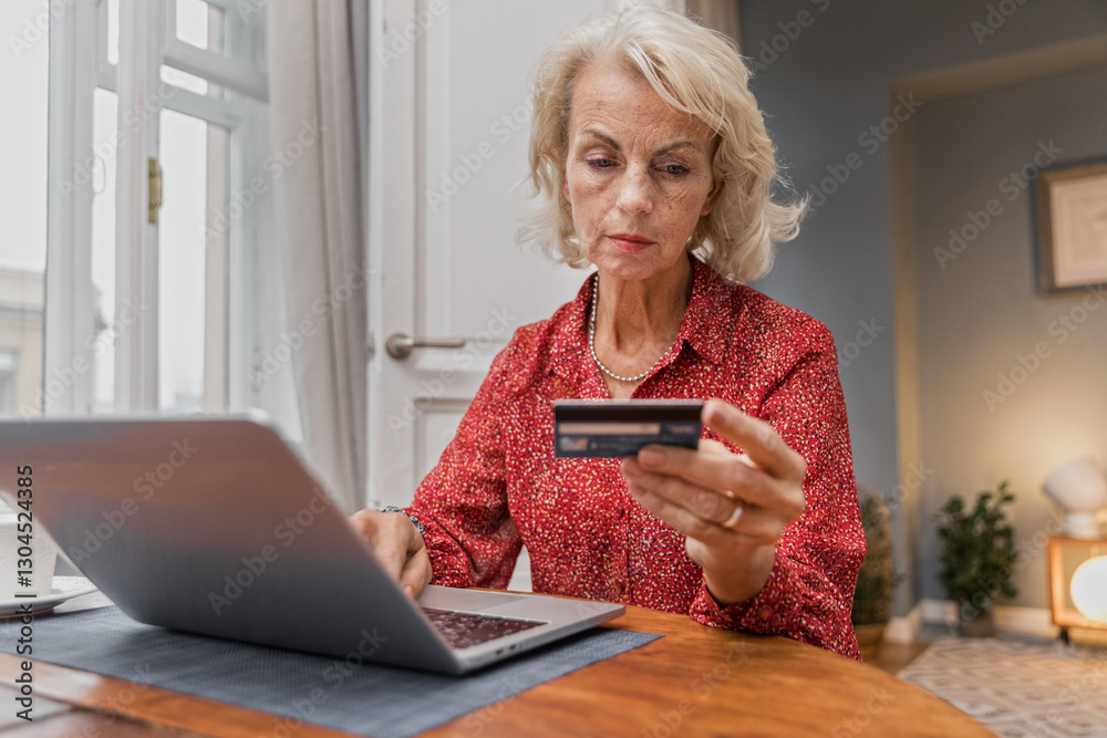 Senior elegant woman sits at table typing doing online shopping. Cheerful aged female makes purchase using laptop. Older focused paying for order by credit card online.