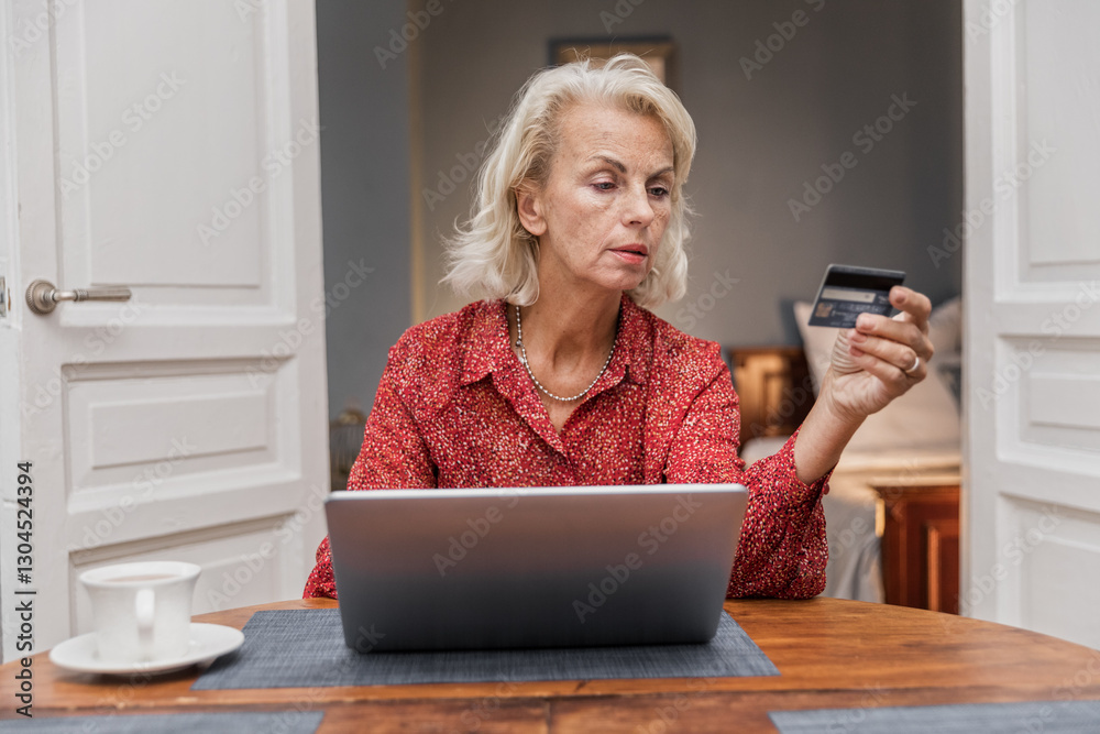 Folgende Fotos können Ihr Interesse wecken: frau, senior, alte leute, shoppen, laptop, online, kreditkarte