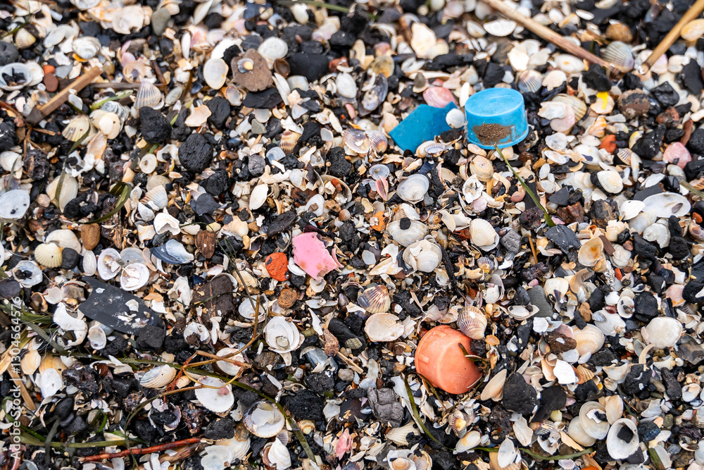 Plastic bottle caps lying on the beach among seashells and pebbles. Ocean pollution by plastic waste