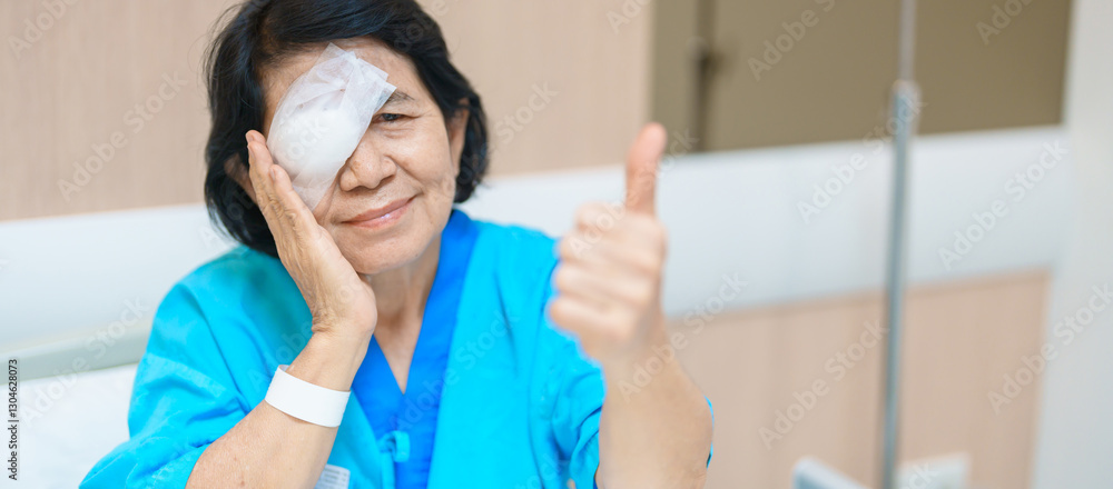 Elderly Woman with eye protective shield after eye surgery. Eye disease, Cataract, Glaucoma, Age Related Macular Degeneration, Diabetic Retinopathy, Vitreous, Lasik, World Glaucoma day and health