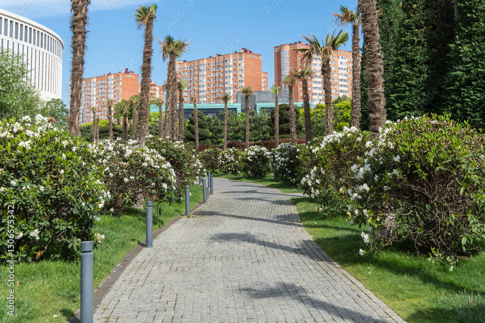Bushes of flowering rhododendron are located in Krasnodar or Galician public landscape city park. Large bushes of rhododendron Azalea japonica grow luxurious inflorescences with white flowers. 2024