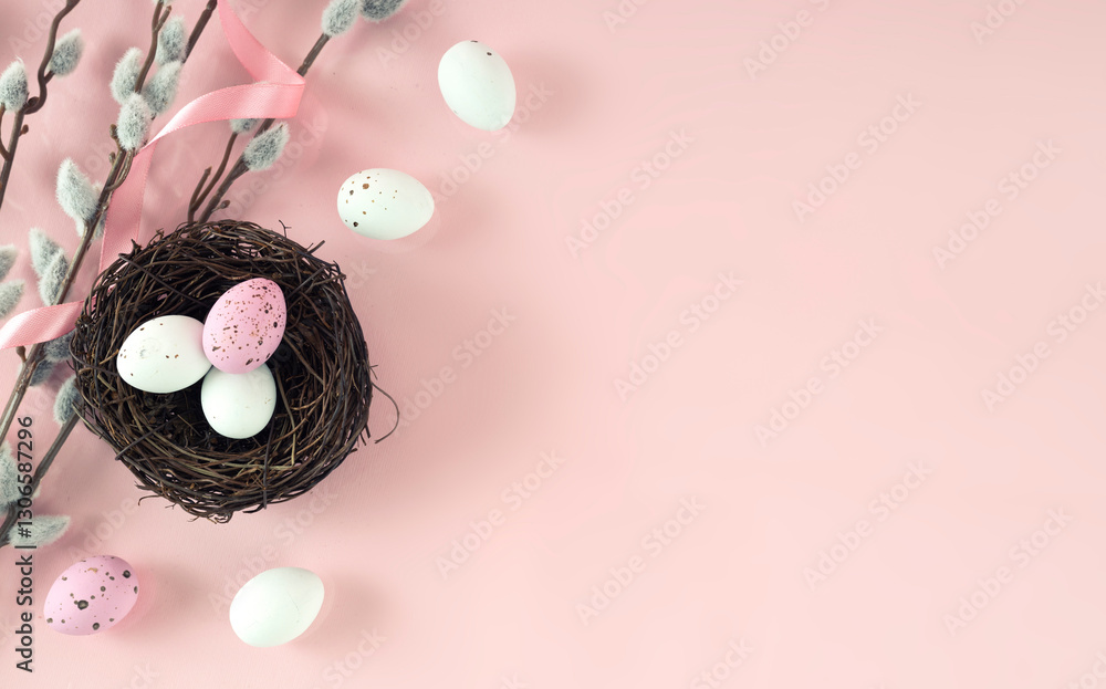 Eggs in nest top view Ester holiday background. Objects on pink background.Spring card, banner,poster.Empty space backdrop.