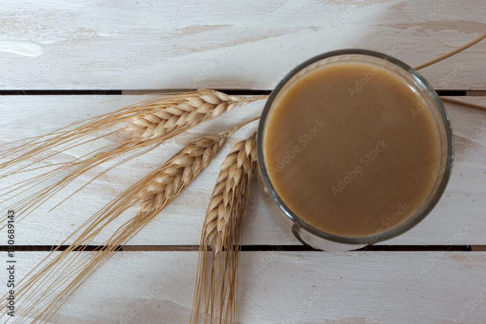 Traditional Drink from Balkan Peninsula Boza (fermented cereal beverage) and wheat over white wooden background