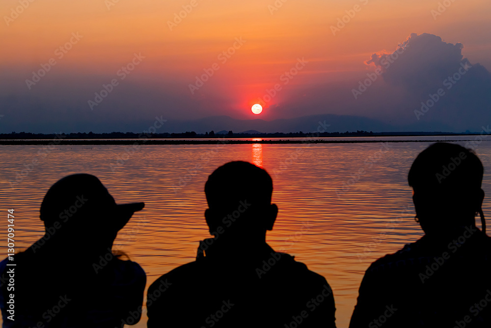 Rear view of three best friends travelers put hands up at sunset. Holiday life concept.