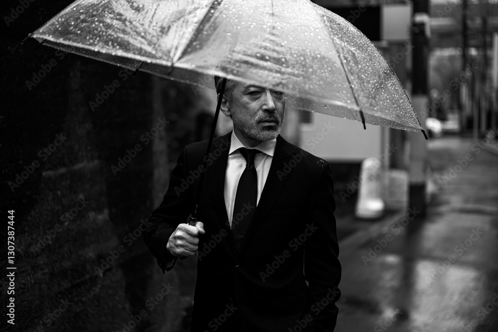 雨の日に傘をさす男性(モノクローム)