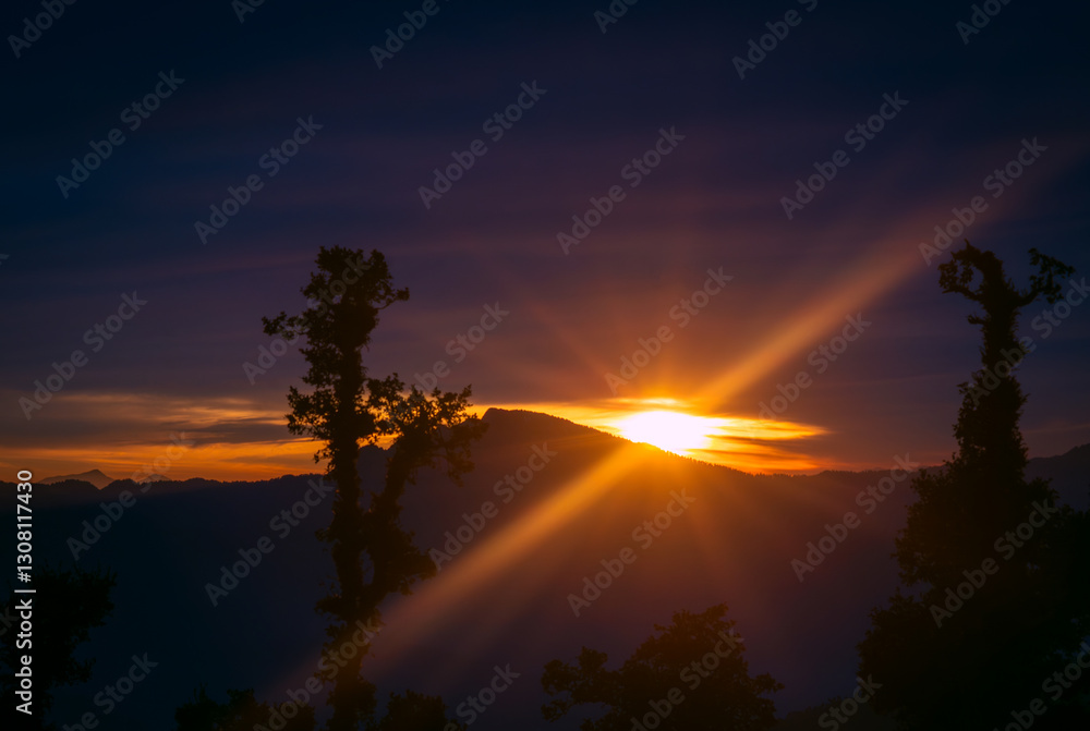 Sunset in the mountains. A scenic, dramatic silhouette view of the sky and clouds is of the Himalayan range of the Kumaun region of Uttarakhand, India.