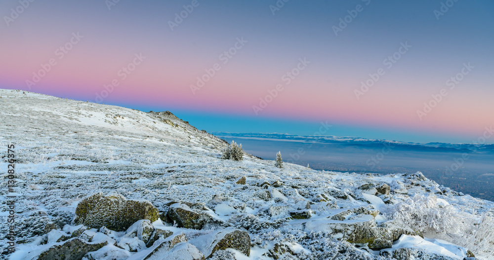 Beautiful frosty sunrise in the mountains - Vitosha, Bulgaria - pink and blue skies over the city in the far background