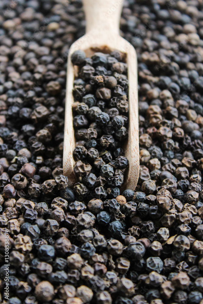 Black peppercorns ( Black pepper ) seeds on wooden shovel spoon with black peppercorns background. Food ingredients. Aromatic spice
