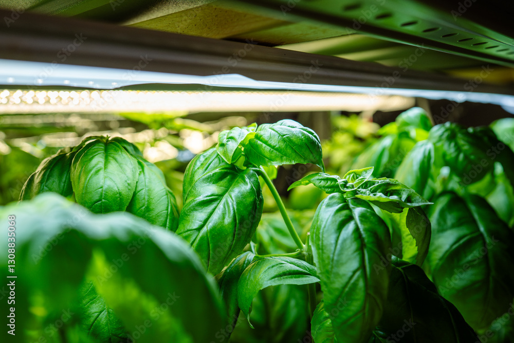 Genovese Basil juicy green leaves germinate under artificial phyto lamps in greenhouse. Greenery care and monitoring of plants for sale, horticulture with agriculture technology, urban farming.