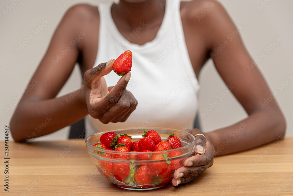 close up of Woman Picking a Strawberry from a Bowl Full of Fresh strawberries