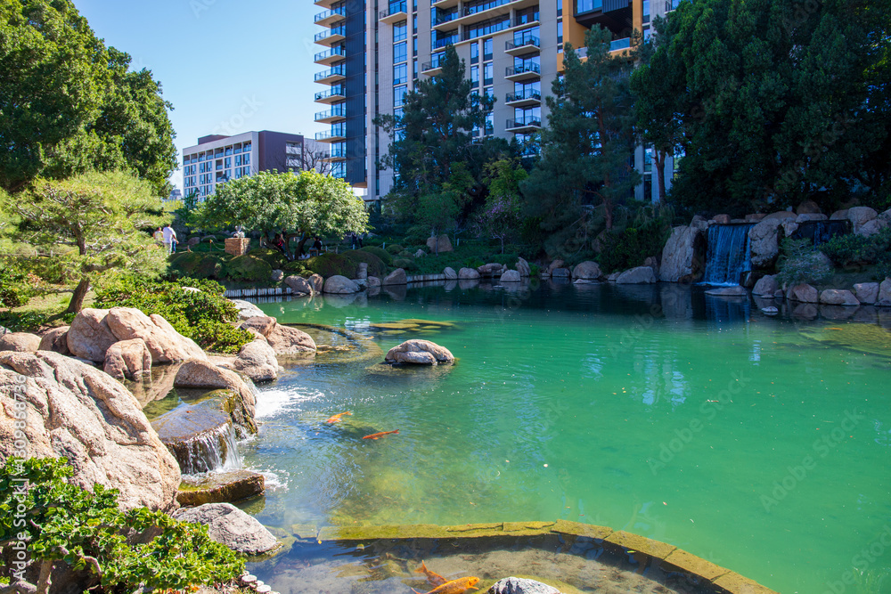the Japanese Friendship Garden, a Japanese stroll garden with a lake and lush green trees, grass and plants in Phoenix Arizona USA