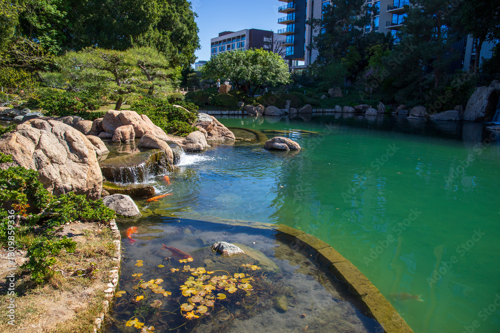 the Japanese Friendship Garden, a Japanese stroll garden with a lake and lush green trees, grass and plants in Phoenix Arizona USA