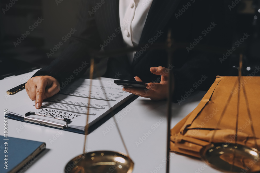 Judge gavel with Justice lawyers having team meeting at law firm background. Concepts of Law and Legal services.