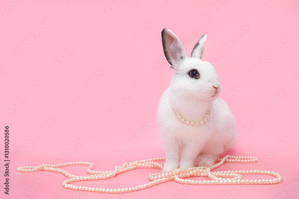 cute white bunny with black eyes wears pearl beads. rabbit sits near pearl jewelry on pink background. fashion beauty photo shoot for easter or women's day