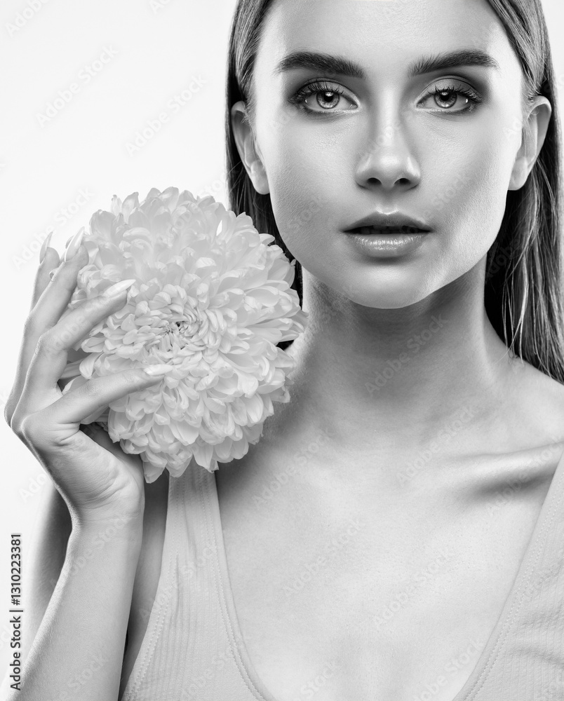 Portrait of an attractive girl with healthy clean skin and beautiful makeup, she is holding a yellow chrysanthemum. Aesthetic cosmetology and make-up concept.