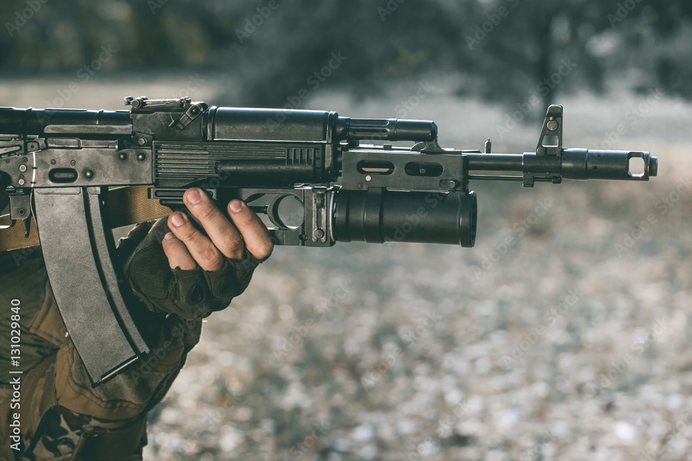 The soldier in the performance of tasks in camouflage and protective gloves holding a gun. War Zone.