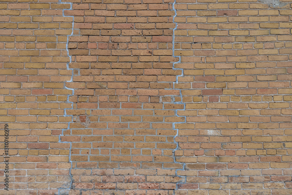Abstract texture background of a 19th century grungy urban brick wall surface, in a light brown color, showing a repaired area where a door was removed
