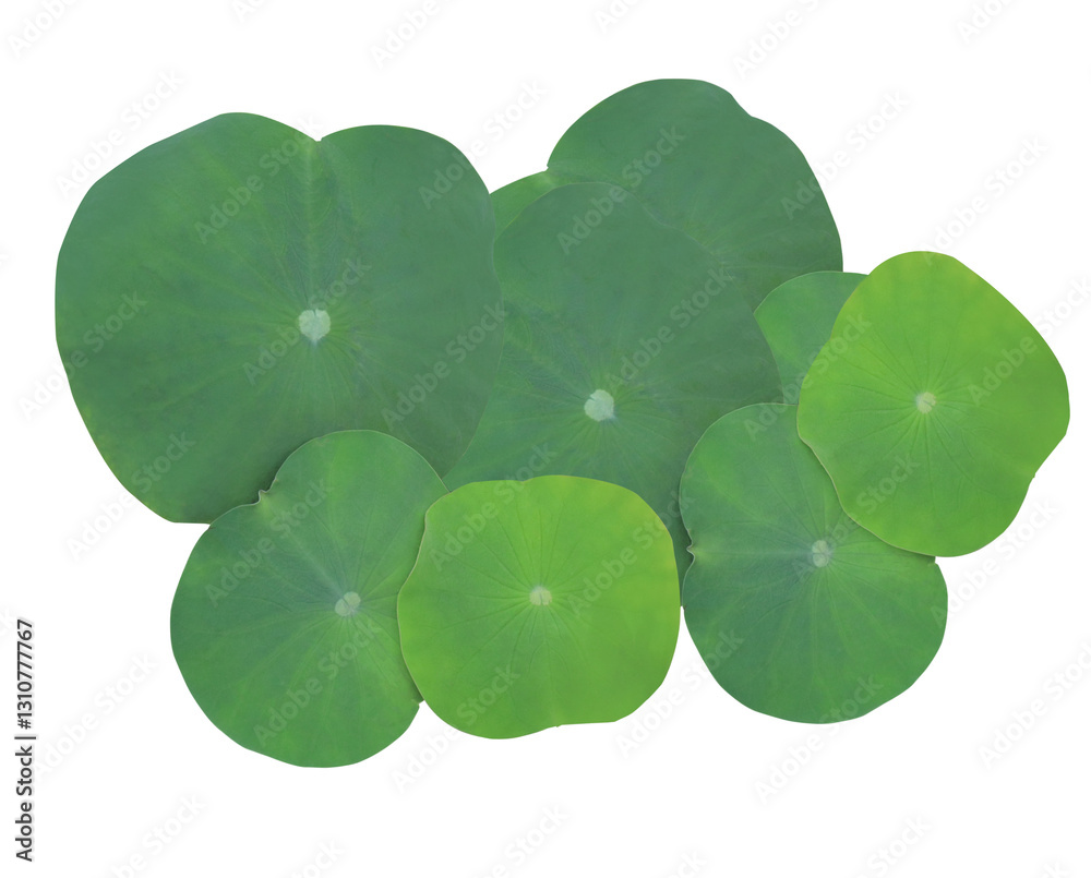 Close up green leaf of lotus or water lily tree isolated on transparent background. Top view of green leaves