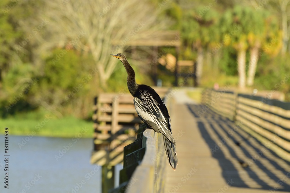 Anhinga on a boardwalk over the Gulf of Mexico.