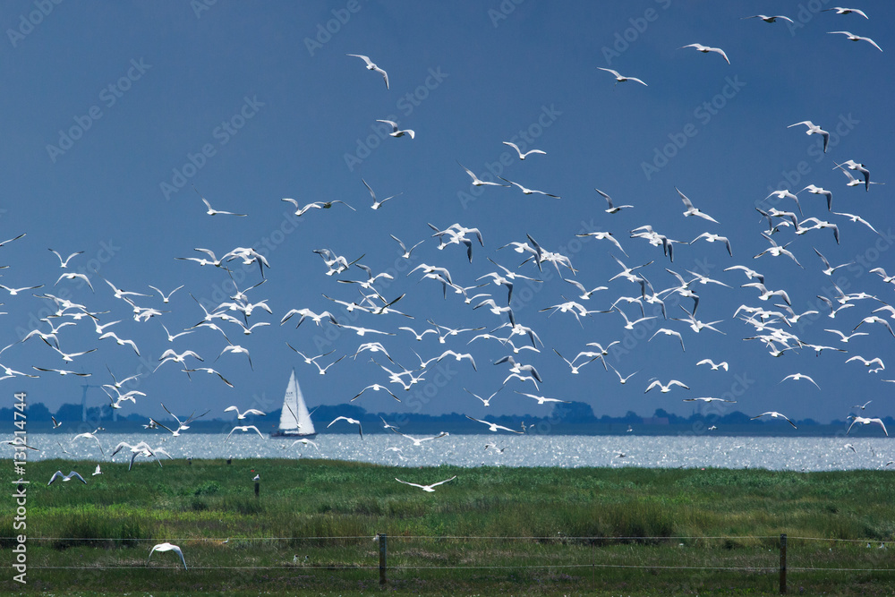 Swarm of seagulls flying in front of sailing boat at the wadden sea. Baltrum, germany