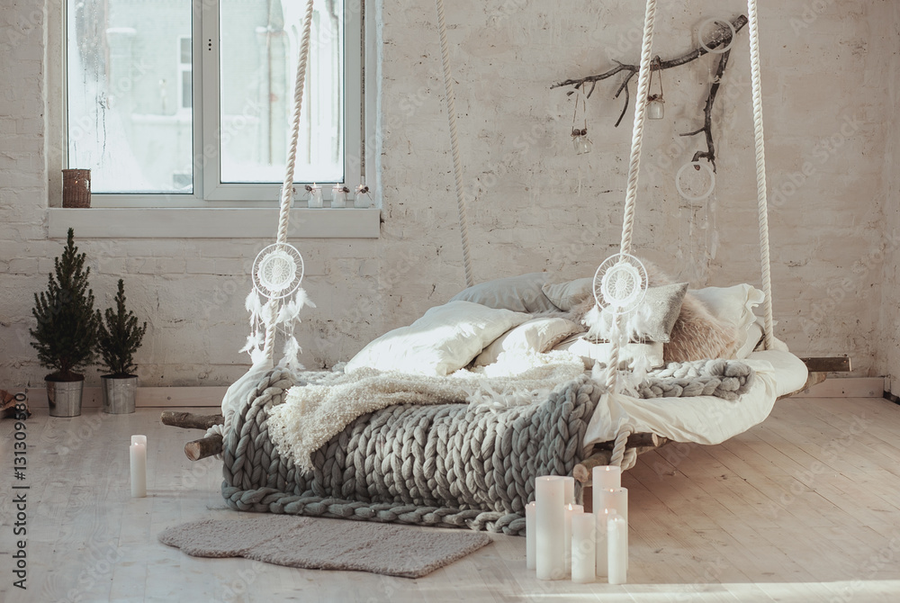 The bed suspended from the ceiling. Grey big cozy blanket knit. Scandinavian style, gray plaid, candles.