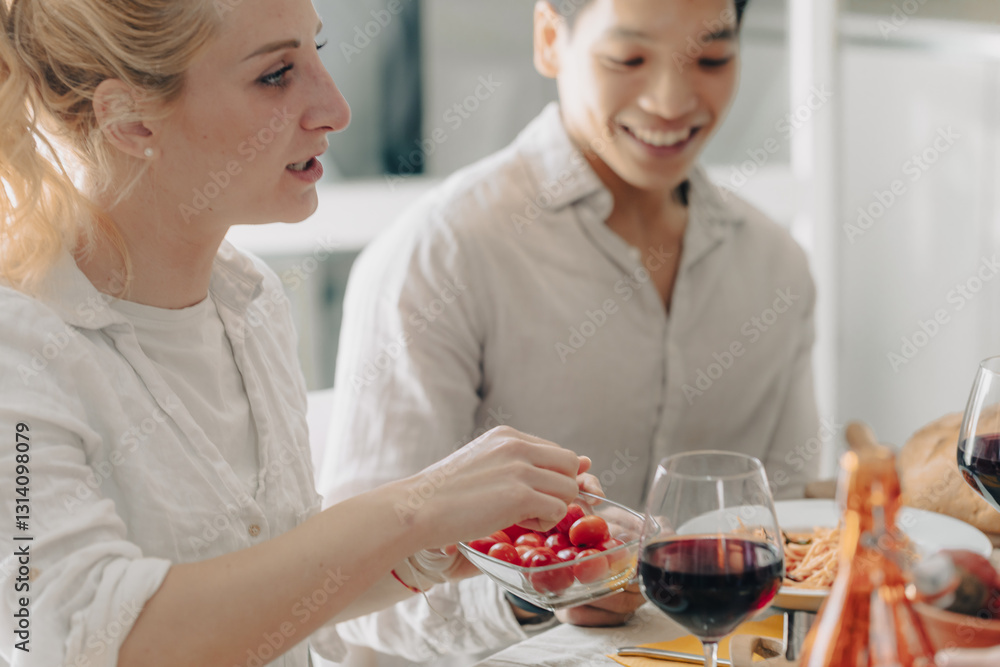Friends enjoying meal with wine and cherry tomatoes at home