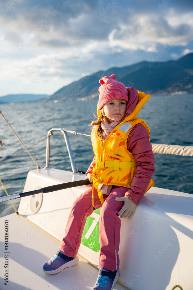Little girl learning to sail a yacht during training in the Kotor Bay, Montenegro, representing adventure, freedom, and nautical sport.