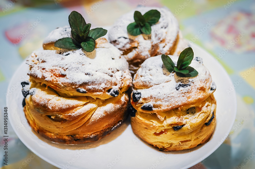 Three delectable pastries, dusted with sugar and garnished with fresh mint, sit invitingly on a plate.
