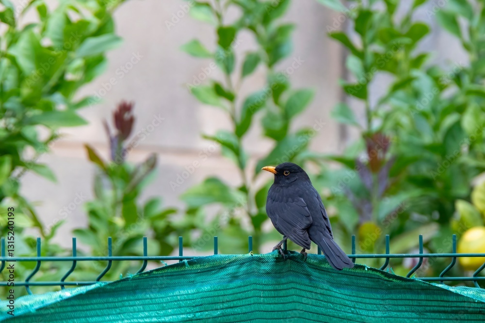 A common blackbird (Turdus merula) perched on a garden fence, surrounded by green foliage. Its dark plumage contrasts beautifully with the vibrant background