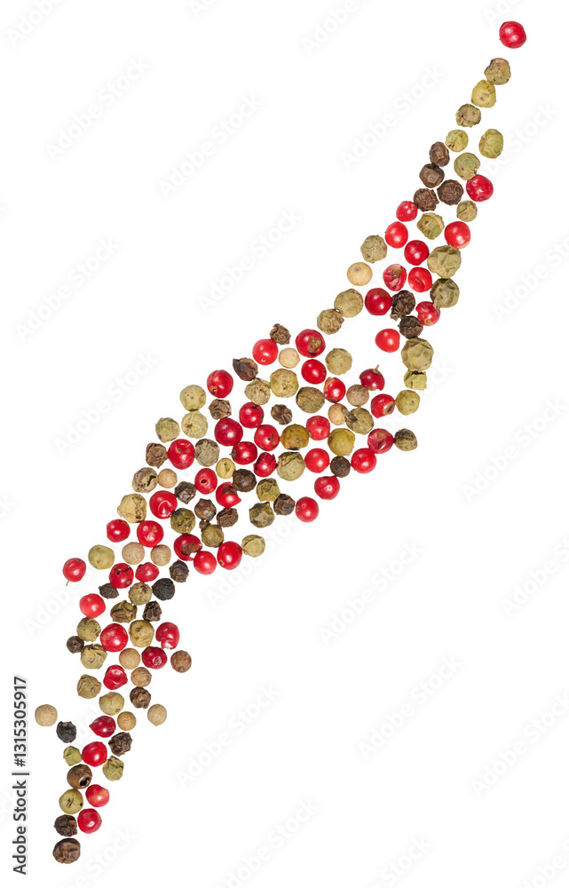 Collection of pink peppercorns arranged in a curved pattern on isolated background. Aromatic berries have a mild