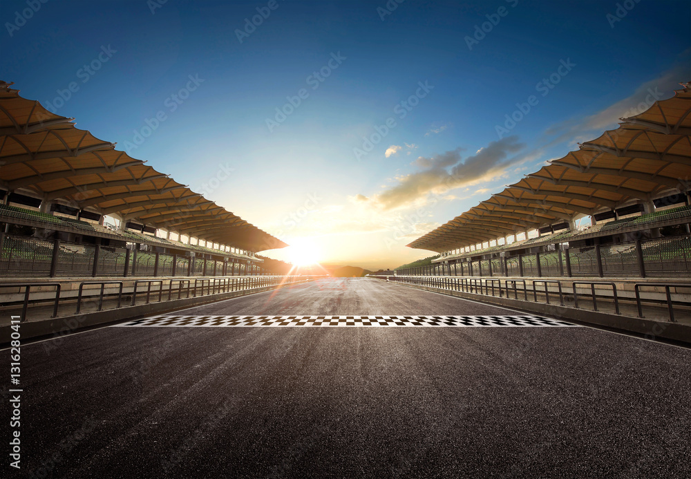 Asphalt racing track finish line, racing sports stadium. 3D Rendering.