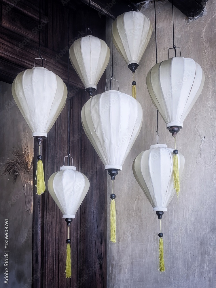 White silk Vietnamese bamboo lanterns, decorated room corner.