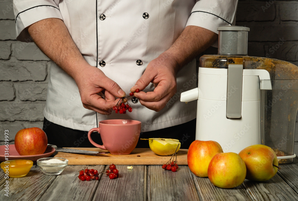A skilled chef meticulously prepares fresh juice using vibrant apples and berries. The warm kitchen ambiance invites a sense of culinary exploration and healthy living. Adding viburnum to a mug