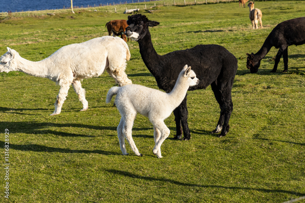 Luxury meets nature: high-quality alpaca wool from ethically raised red, white, and black alpacas in a pristine, green environment. A fusion of sustainable fashion, well-being, and premium craftsmansh