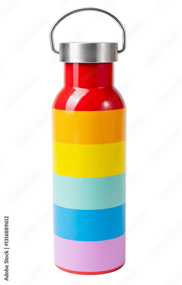 Reusable steel water bottle with colorful rainbow stripes isolated on transparent background,highlighting eco-friendliness and helping to maintain body hydration for healthy lifestyle,