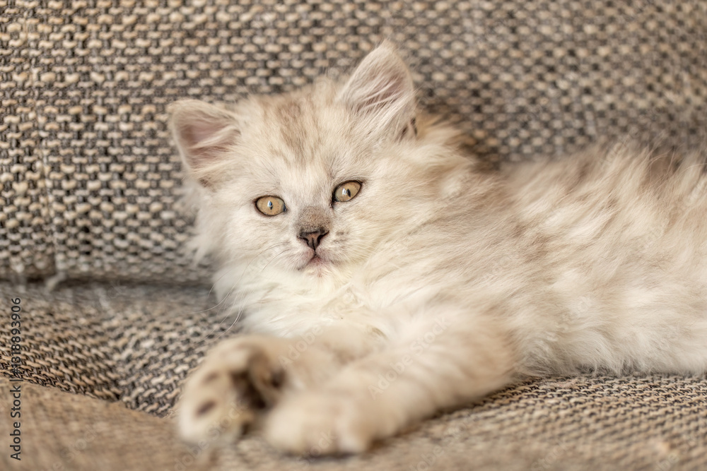 A cute silver tabby ragdoll crossbreed kitten playing with a cat toy on a couch