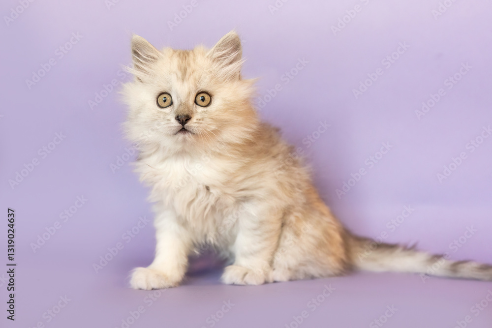 A cute silver tabby ragdoll crossbreed kitten in front of purple studio background