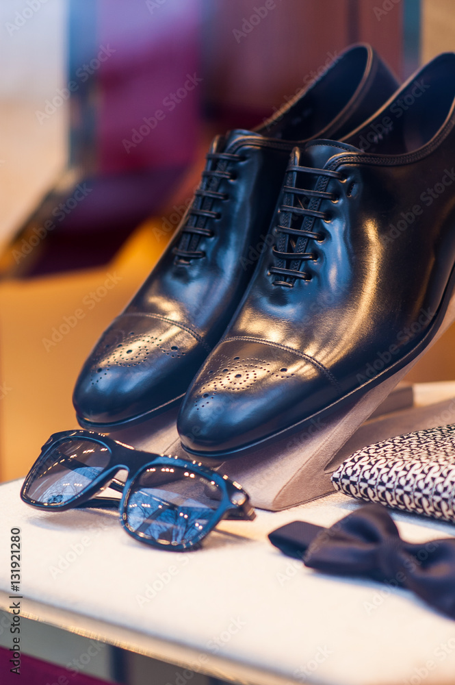 A pair of luxurious leather shoes with accessories in the shop window.
