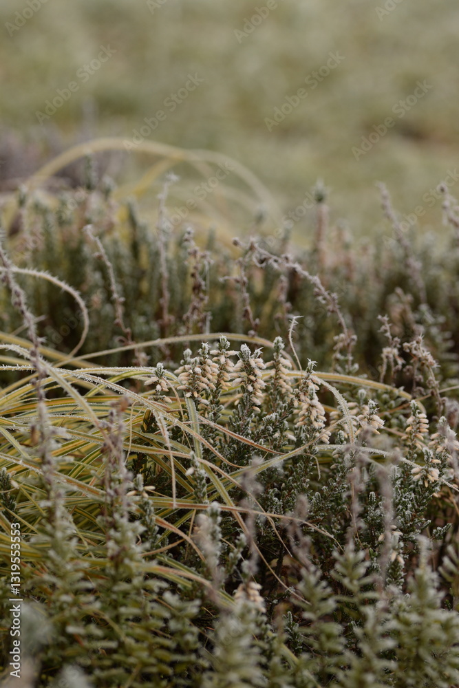 Heathers shrubs somewhat frosted in early spring, heather shrubs and ornamental grasses on bokeh spring garden background, selective focus.