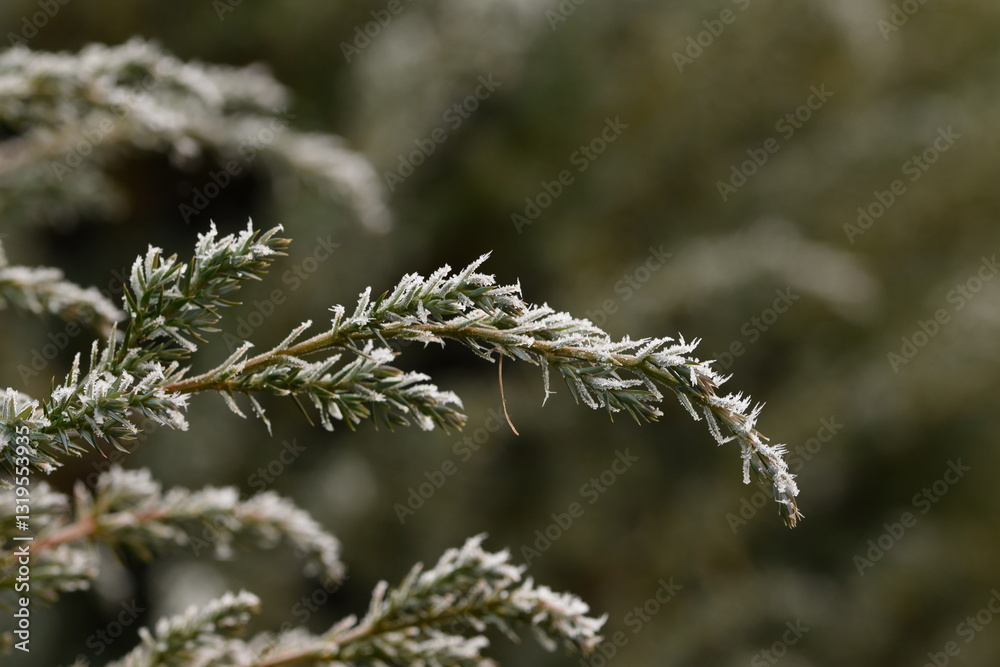 Juniper branches hoarfrosted, rime , natural winter background space for text, selective focus, bokeh, background.